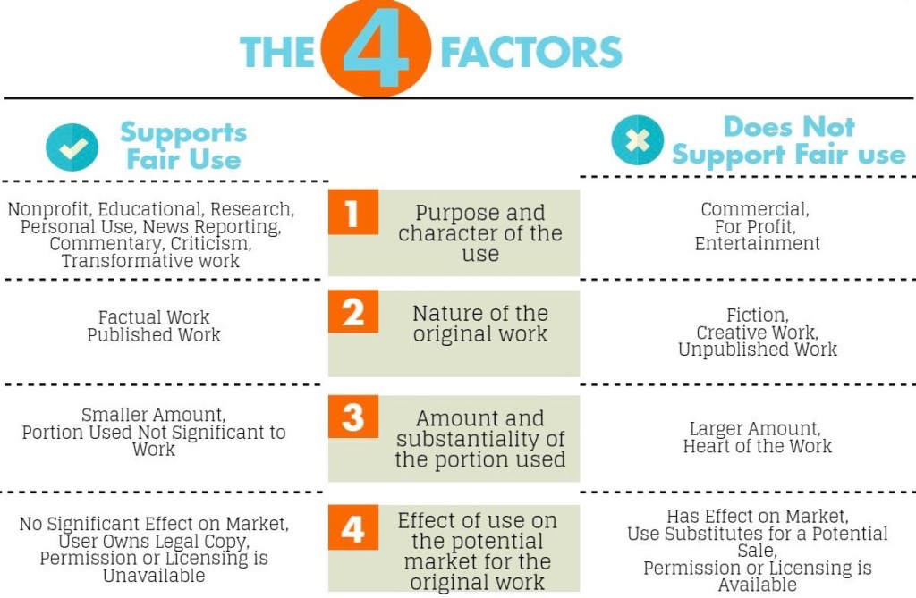 This is where fair use comes in. Fair use lets you use a bit of someone else’s copyrighted material without asking, but only for certain things like comments, critiques, news, teaching, or making fun of things.