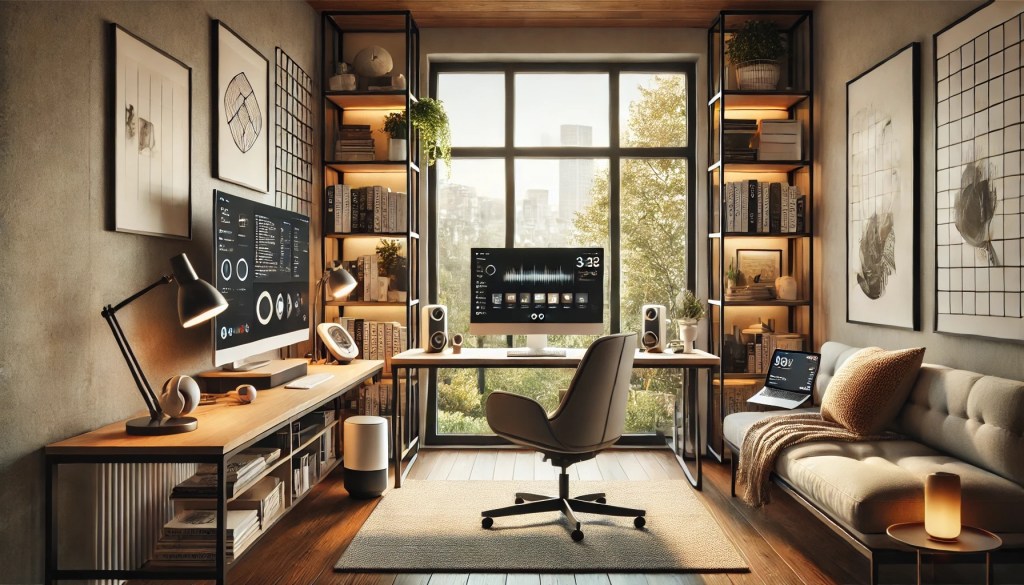 I envision a workspace that harmonizes modern technology with timeless comfort. It’s more than just a desk and a chair—it’s an ecosystem designed to spark creativity and enhance productivity.