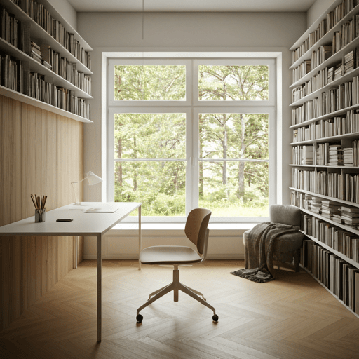 The furniture reflects Scandinavian minimalism—clean lines, functional design, and subtle elegance. A sleek desk and an ergonomic chair make the space not just visually appealing but also comfortable for long hours of writing and consulting.