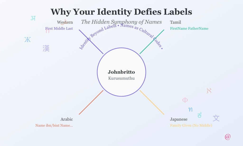 My name, Johnbritto Kurusumuthu, mirrors this Tamil tradition. “Kurusumuthu” is the name of my father, while “Johnbritto” fuses two names into one—a common practice in Christian Tamil communities to honour saints (St. John de Britto, a 17th-century missionary to India). Here, the “middle” isn’t a separate slot—it’s woven into the first name itself.
