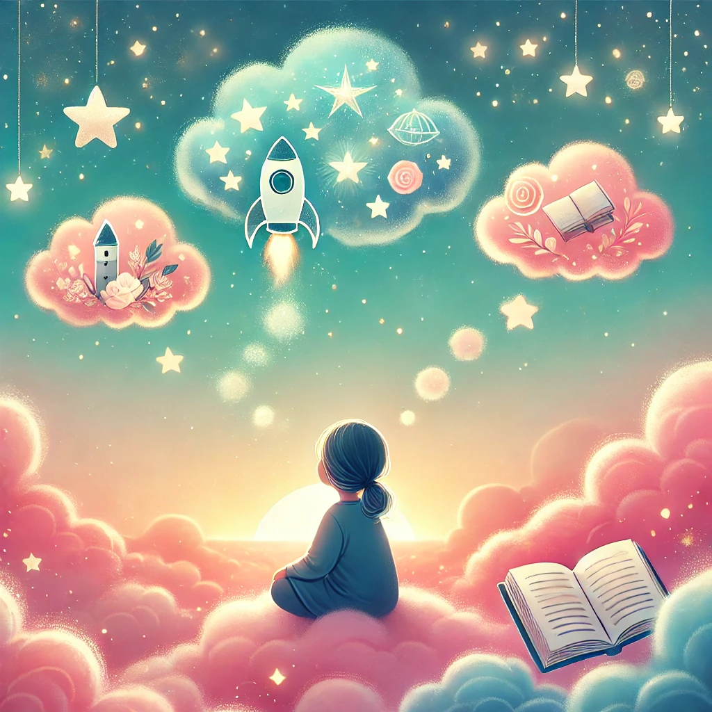This image captures the dreamy essence of childhood imagination, with a silhouette of a child on a cloud, surrounded by thought bubbles filled with stars, a rocket, and a book.