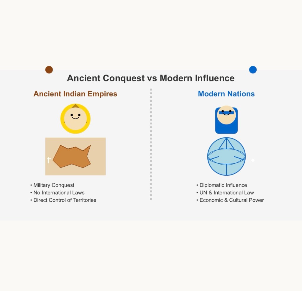 While ancient Indian kings could expand their empires through military conquests, modern nations operate under a different set of global rules. Today, annexing a neighboring country is met with international resistance, economic sanctions, and military retaliation. Instead, nations rely on economic power, cultural influence, and diplomatic strategies to extend their reach.