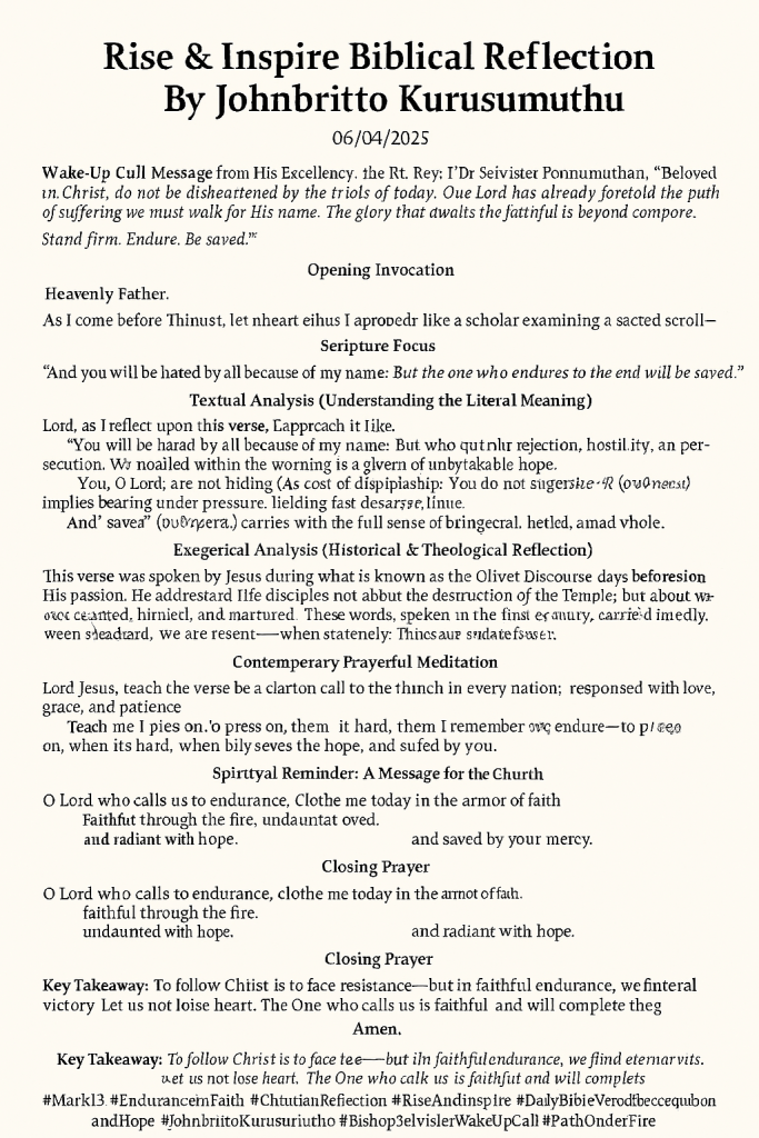 In a world where faith is often tested and truth stands on trial, today’s verse from Mark 13:13 emerges as both a solemn warning and a powerful promise. “You will be hated by all because of my name. But the one who endures to the end will be saved.” These words from Christ are not meant to instill fear, but to awaken faith. They are a divine call to perseverance, a reminder that discipleship is a path of both hardship and hope. As we step into this prayerful reflection, may our hearts be stirred with courage and our souls be anchored in the assurance that enduring in His name leads to eternal salvation.