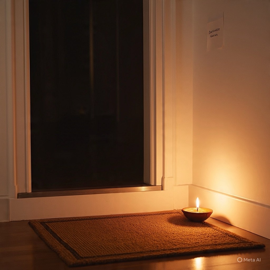 An evening-lit doorway with a neatly aligned mat, a small candle or diya flickering beside it, soft shadows stretching across a clean threshold, and a handwritten affirmation gently taped to the inside of the doorframe. The mood is serene, sacred, and still—evoking intentional closure and a transition into peace.