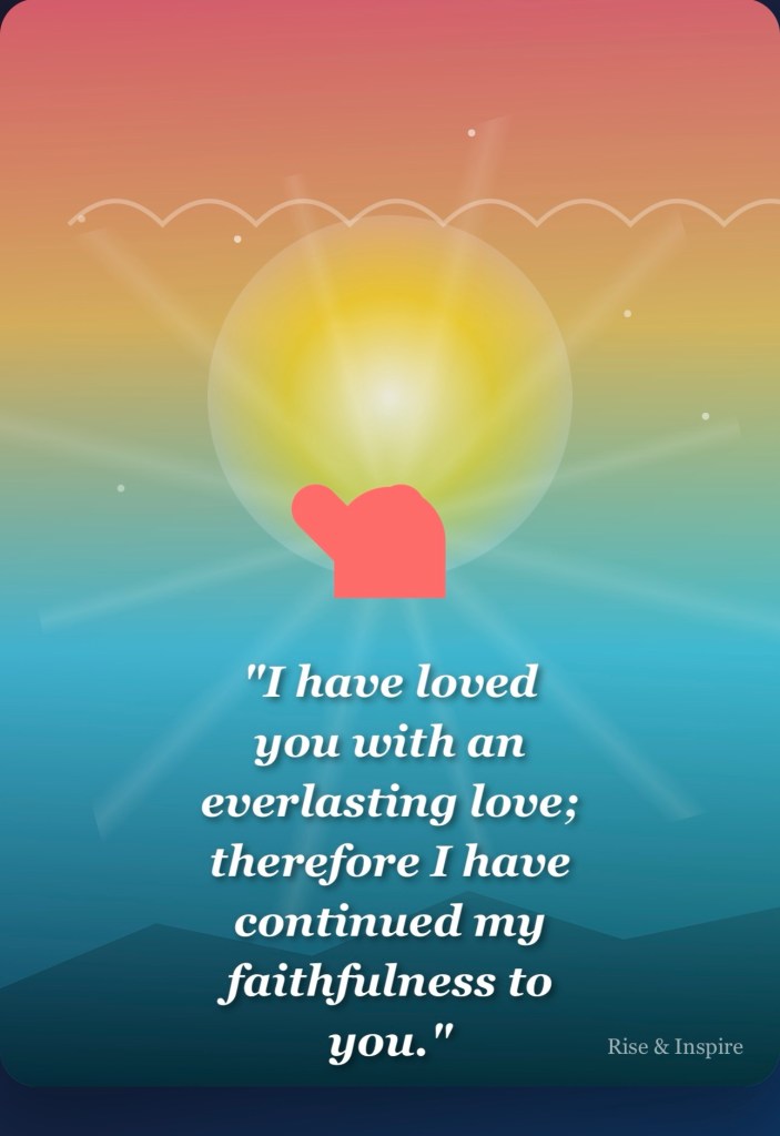 “Beloved children of God, as we awaken to this new day, let us remember that we are not merely recipients of divine love, but vessels through which God’s everlasting love flows into a world that desperately needs healing. Today’s verse from Jeremiah reminds us that God’s love is not conditional upon our performance, but eternal in its nature. Rise up, not in your own strength, but in the assurance of His unwavering faithfulness. Let this truth transform not just your morning, but your entire approach to life’s challenges and opportunities.”