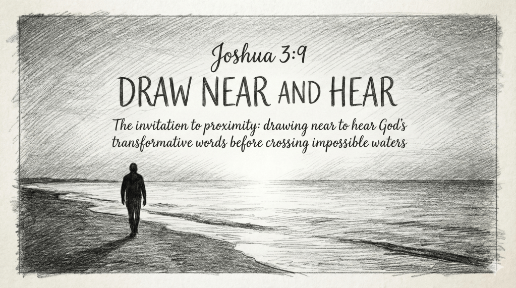 There is something deeply intimate about an invitation to draw near. In Joshua 3:9, we find ourselves standing with the Israelites at the edge of the Jordan River, at a threshold moment between wandering and promise. Joshua does not shout instructions from a distance. He does not issue commands to be obeyed from afar. Instead, he extends an invitation that echoes through the centuries to our own hearts today: “Draw near and hear the words of the Lord your God.”