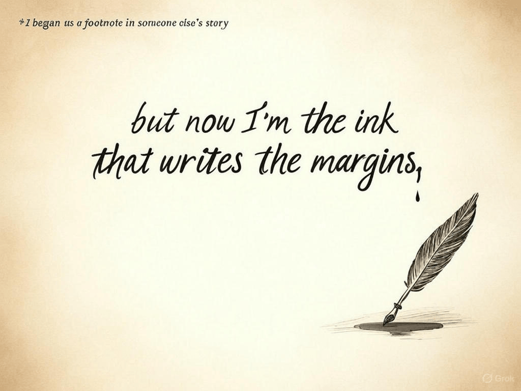 “I began as a footnote in someone else’s story, but now I’m the ink that writes the margins.”