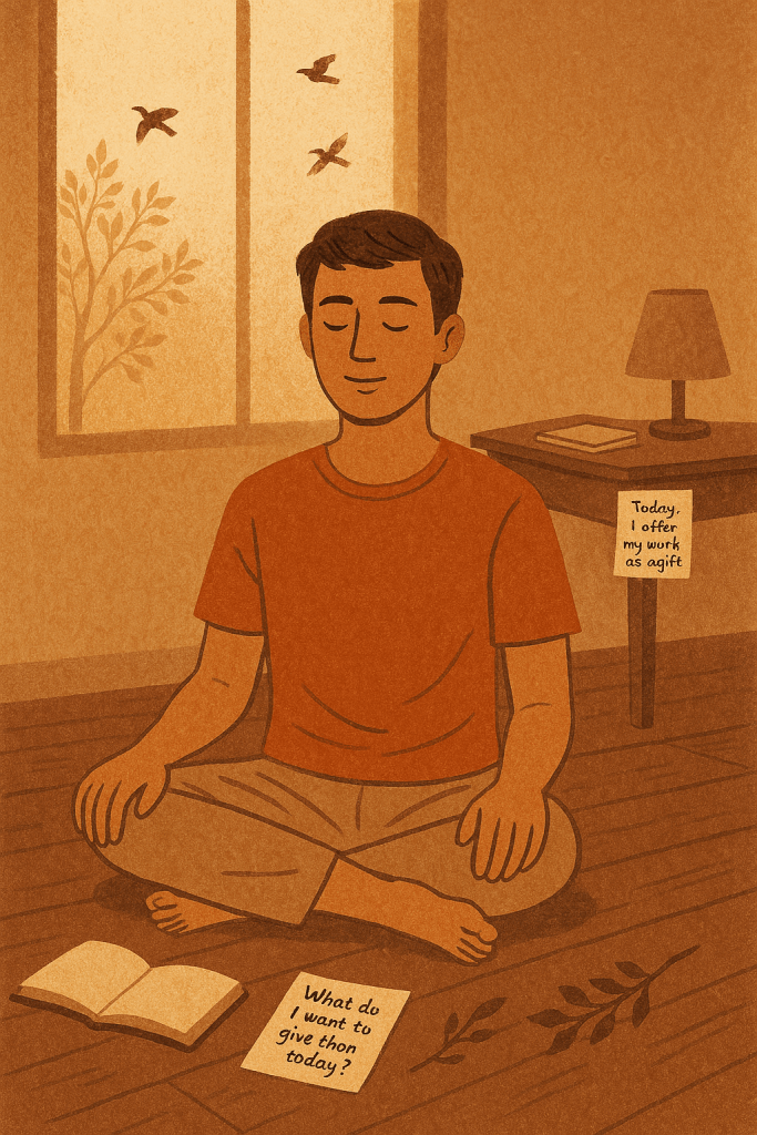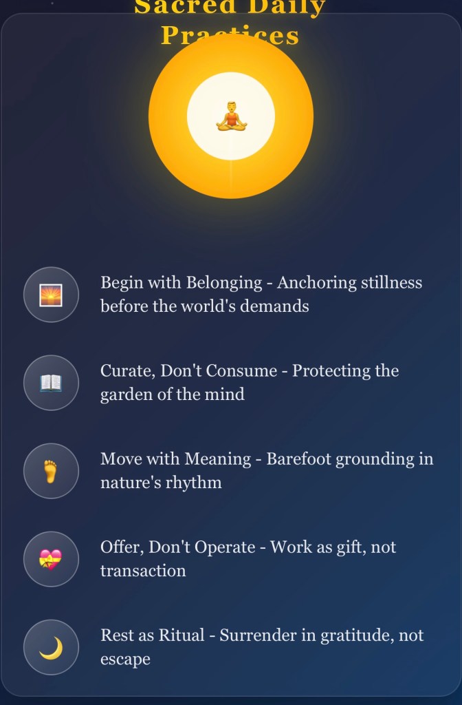 My daily habits are not just routines but intentional practices—anchoring stillness each morning, curating meaningful inputs, walking mindfully, offering my work as service, and ending the day with gratitude—designed to nurture awareness, purpose, and peace.