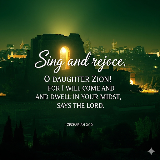 As you carry Zechariah 2:10 into your week, may it remind you that you never face anything alone. May it inspire you to sing and rejoice not because circumstances are perfect, but because the perfect God chooses to dwell imperfectly with you. And may your life become a dwelling place where others encounter the transforming presence of the living God.
