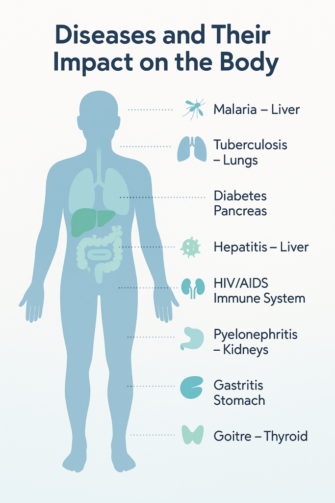 Explore how diseases like malaria, diabetes, and tuberculosis affect specific body parts such as the liver, pancreas, and lungs. Learn prevention tips and stay informed with this Rise&Inspire health guide.