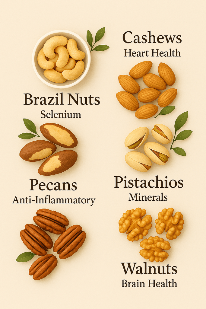 Discover the top benefits of nuts like cashews, almonds, pistachios, walnuts, pecans, and Brazil nuts. Learn how these superfoods can support better sleep, brain health, immunity, and more for a healthier lifestyle.