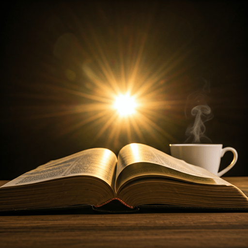 🎄Image of sunrise with an open Bible and a cup of coffee.