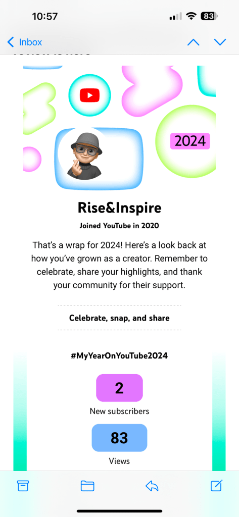 As 2024 comes to a close, I want to share a small yet meaningful milestone from my journey on YouTube. This year, I gained 2 new subscribers and 83 views—modest numbers, but each view and subscriber represents someone who connected with my content.