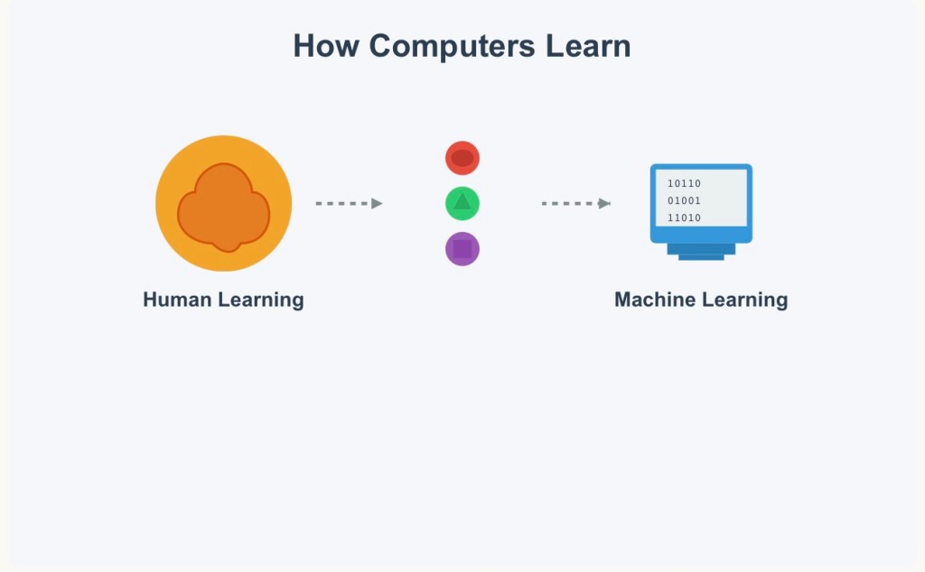 Instead of manually programming a computer to follow strict rules, we feed it a lot of data (examples), and it learns from that data to make decisions or predictions on its own.